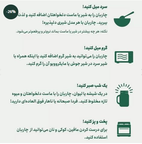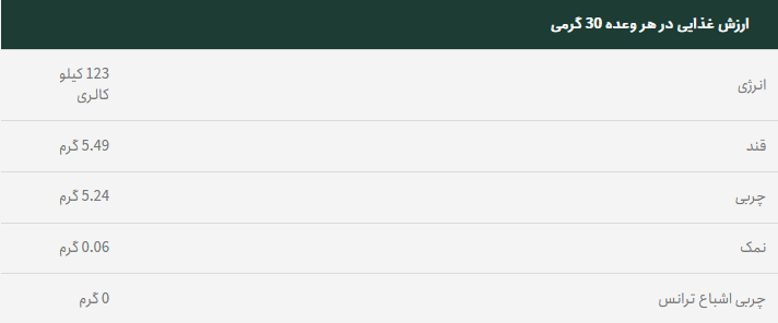 - 135 کیلوکالری در هر وعده ۳۰ گرمی (مناسب رژیم)